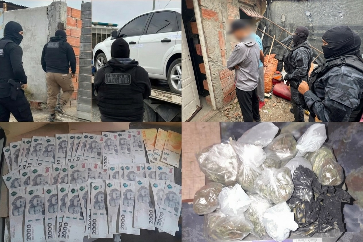 Durante la mañana se concretaron tres allanamientos: uno en el Área 12 de Rawson, otro en Playa Unión y un tercero en el barrio Comercio de Puerto Madryn. Como resultado de los procedimientos, se secuestraron teléfonos celulares, prendas adquiridas con las tarjetas robadas, comprobantes de compra, dinero en efectivo y otros elementos vinculados a la posible comercialización de estupefacientes.